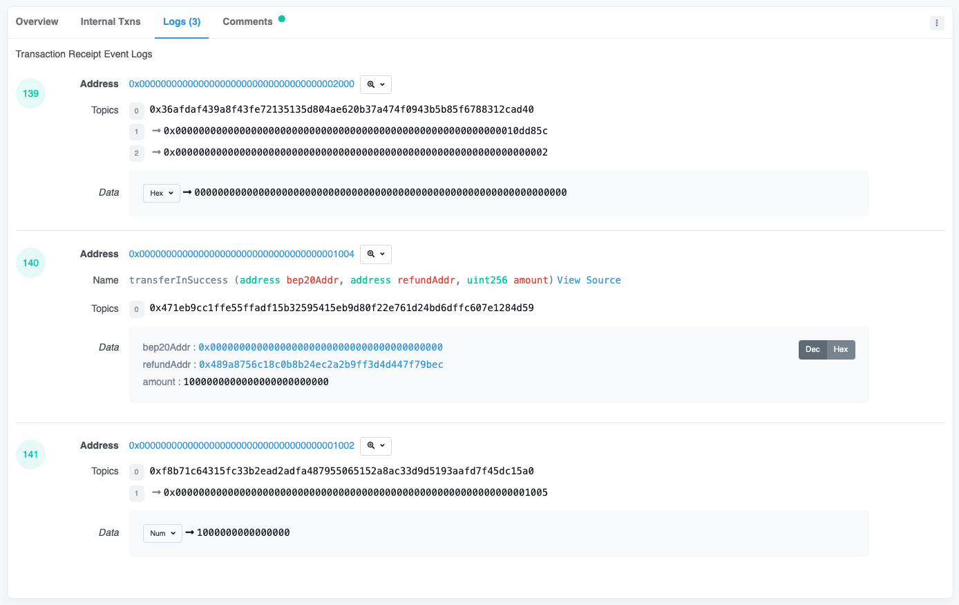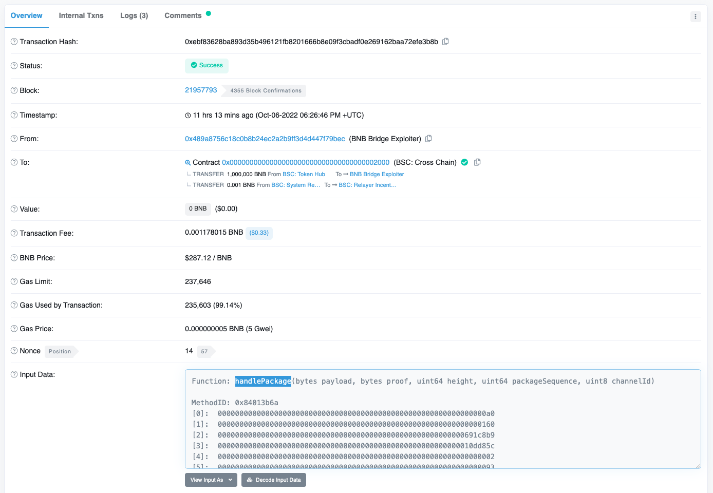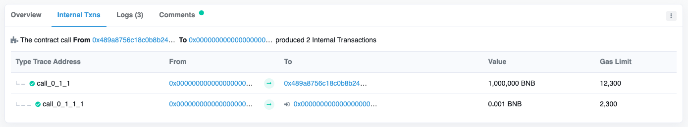 • 이는 BSC-Chain의 Genesis에 배포된 "BSC Cross Chain" 컨트랙트의 handlePackage 메소드가 실행되어 100만개 BNB가 "BSC Token Hub" 컨트랙트로부터 전송됩니다. 참고[5-2]