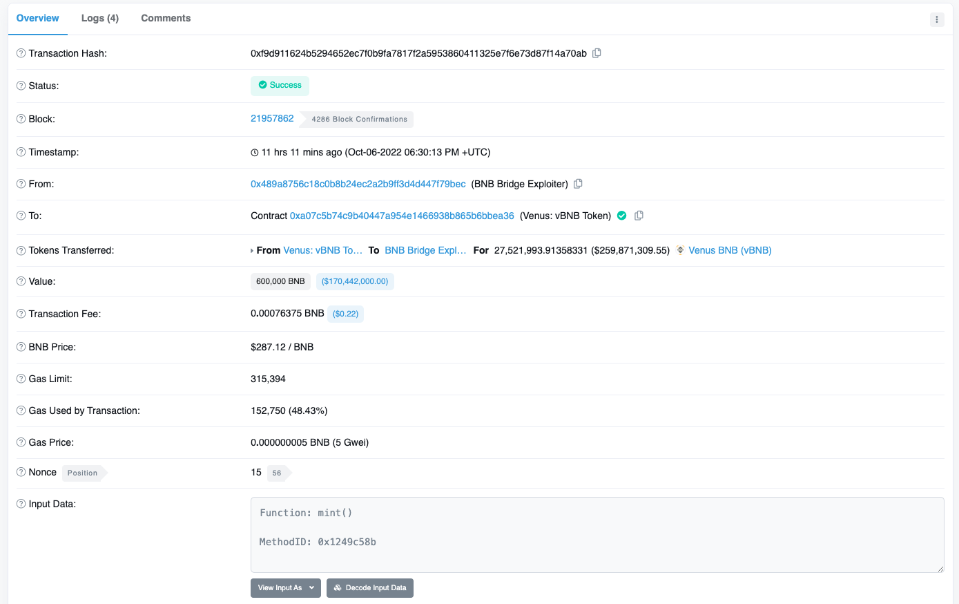 • vBNB 토큰 컨트랙트로 부터 해커 계좌로 약 60만 vBNB 토큰이 발행(Mint())되어 입금되는 것이 확인됩니다. 참고[5-1]