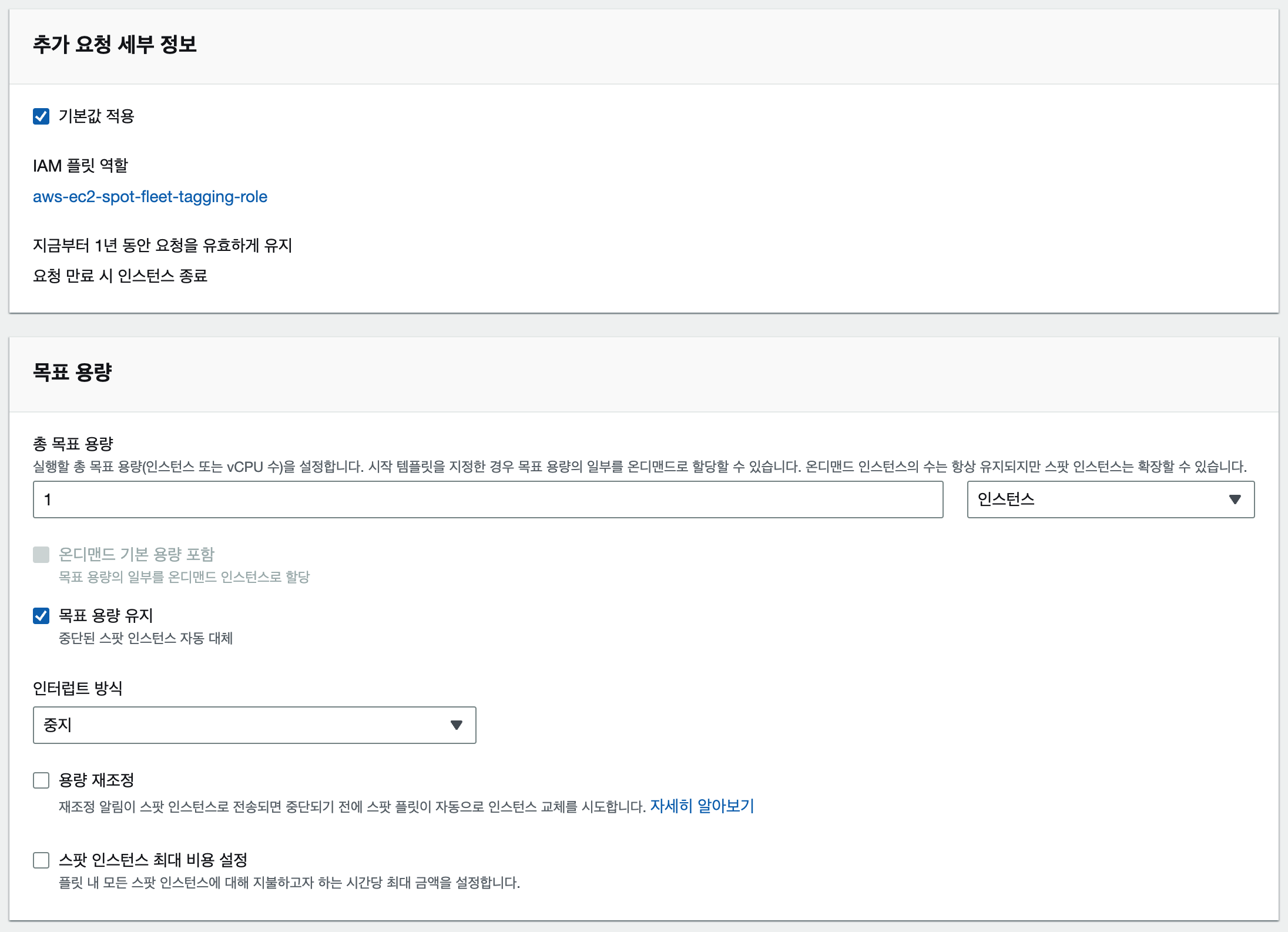 - 목표 용량 유지를 체크하여 인스턴스가 중단되면 자동으로 대체되도록 설정합니다.