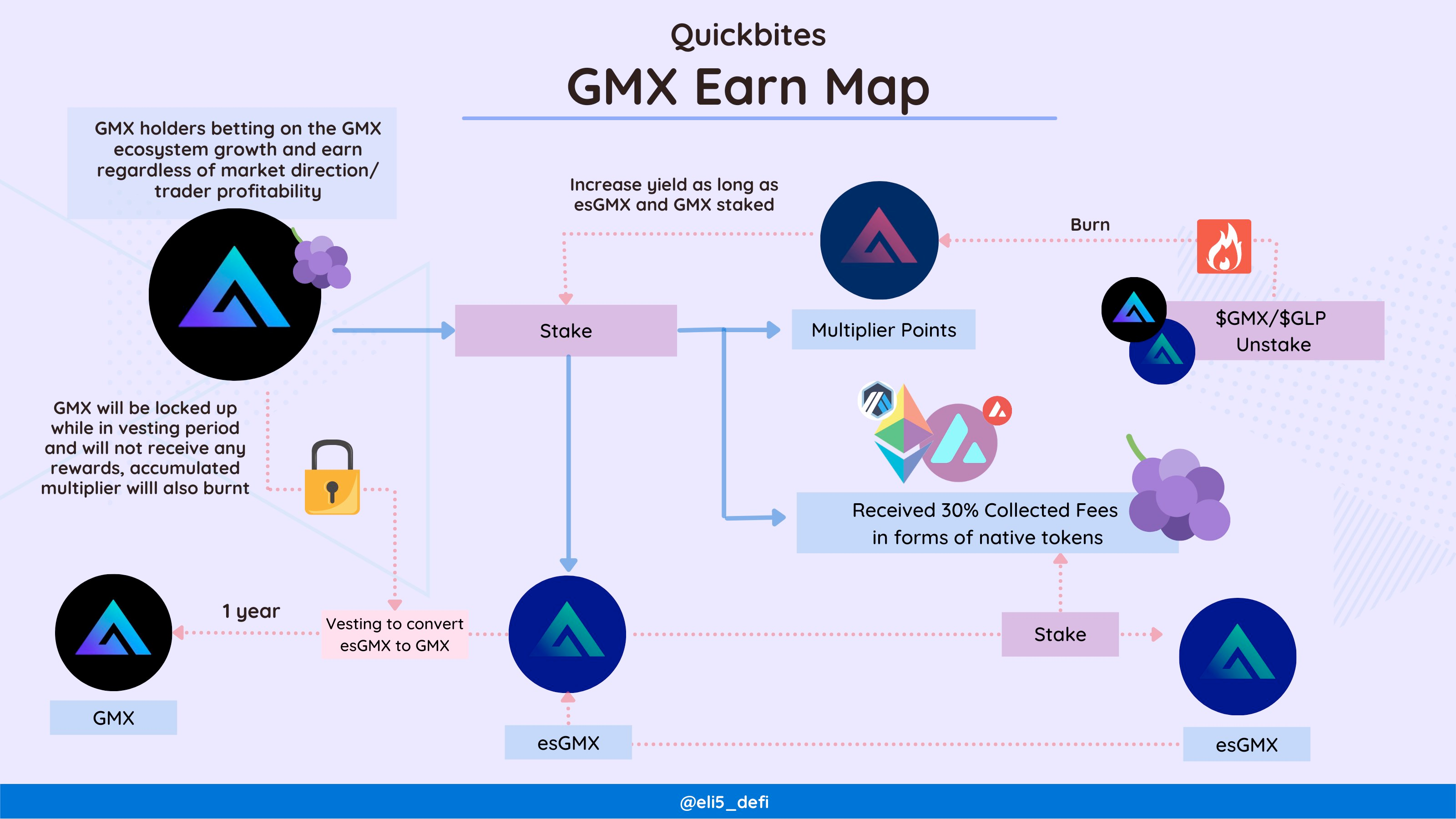 - GMX: 스테이킹시에 ETH / AVAX, esGMX, Multiplier Points 보상