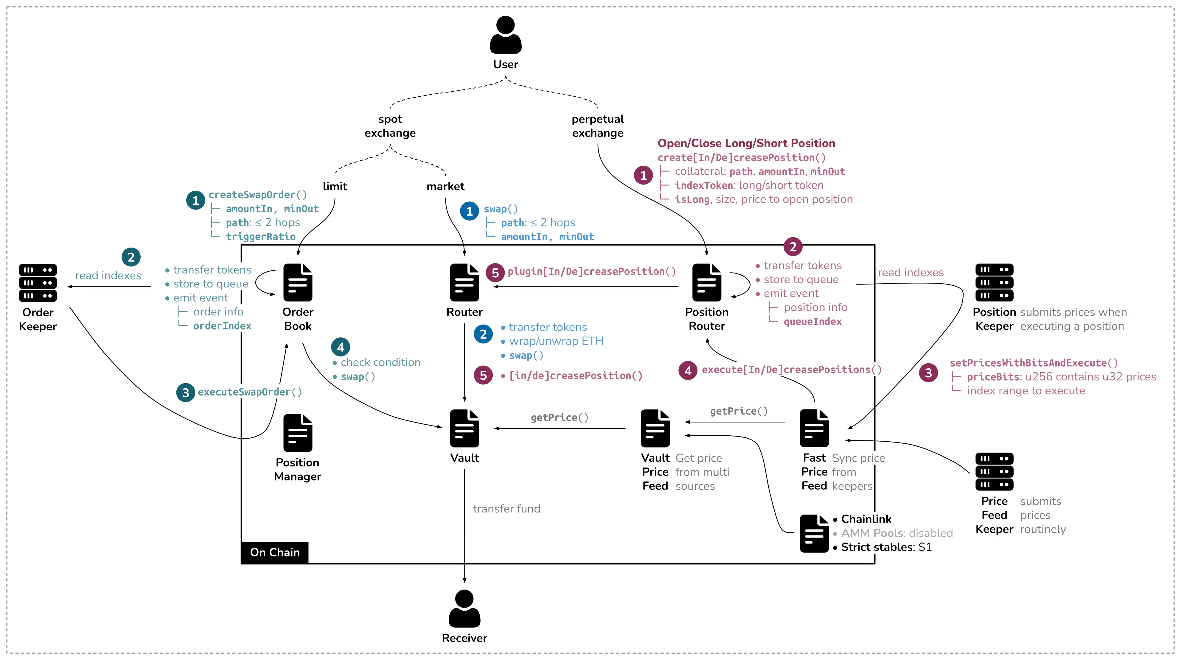 PositionRouter 계약은 롱/숏 포지션을 늘리거나 줄이는 두 부분으로 구성된 트랜잭션 프로세스를 처리합니다. 프로세스는 선행 실행 문제를 줄이는 데 도움이 됩니다.