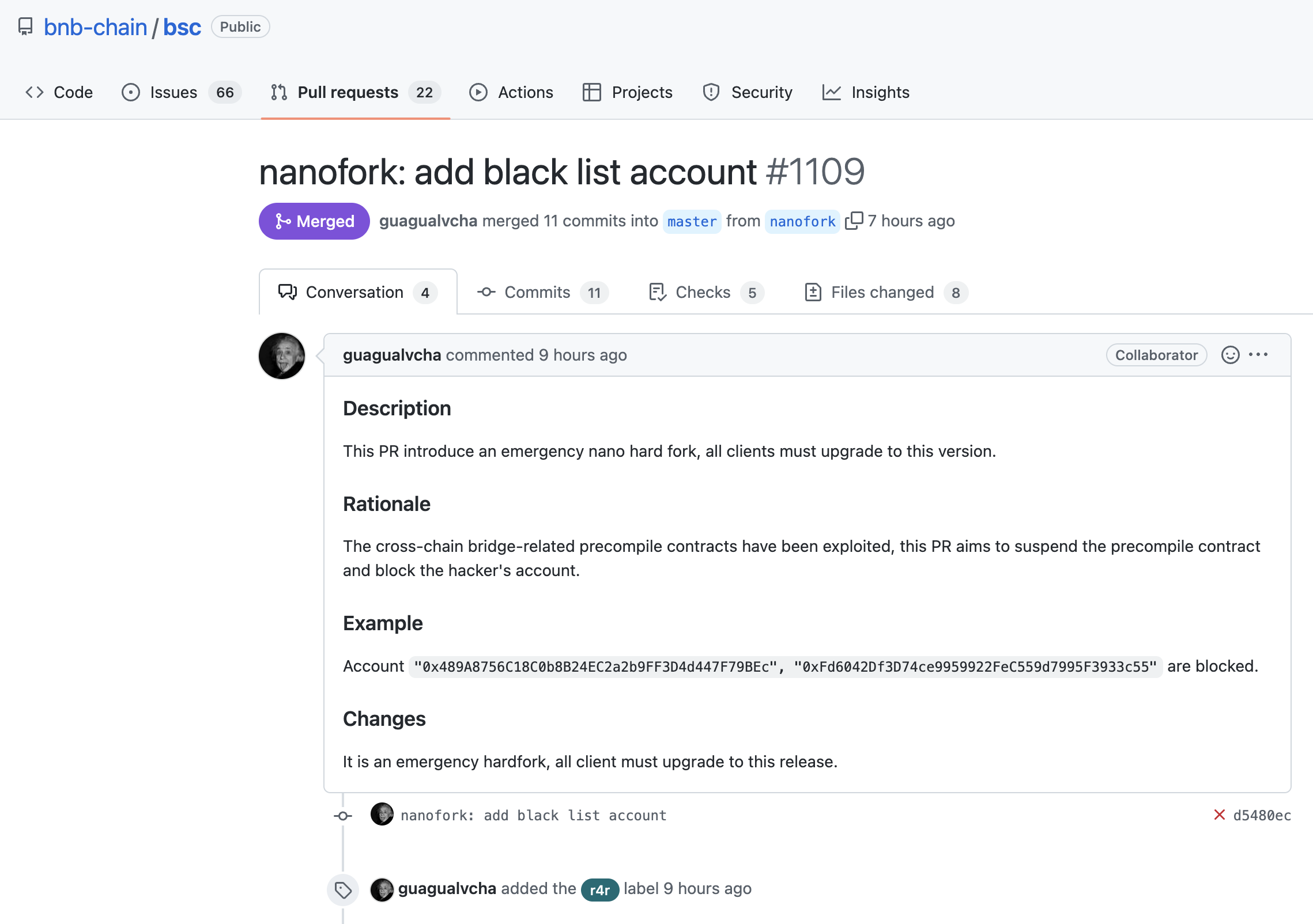 We want to confirm that we coordinated with validators to temporarily suspend BSC after having determined an exploit on a cross-chain bridge, BSC Token Hub- which resulted in extra BNB. We have asked all validators to temporarily suspend BSC. The issue is contained now. Your funds are safe. We apologize for the inconvenience and will provide further updates accordingly. The Community has already played a pivotal role in assisting and helping freeze any transfers. All funds are safe. We want to thank the node service providers for their quick and attentive response. A huge thank you to the following: Hash, Neptune, TW Staking, BSCScan, Legend, CertiK, Figment, NodeReal, Namelix, Defibit, Fuji, InfStones, MathWallet, Pexmons, Ankr, BNB48 Club, Avengers, Tranchess, Coinbase Cloud For their quick and decisive actions - a true community. Initial estimates for funds taken off BSC are between $100M - $110M. However, thanks to the community and our internal and external security partners, an estimated $7M has already been frozen. We are humbled by the speed and collaboration from the community to freeze funds. Thank you to everyone who helped and gave their support.